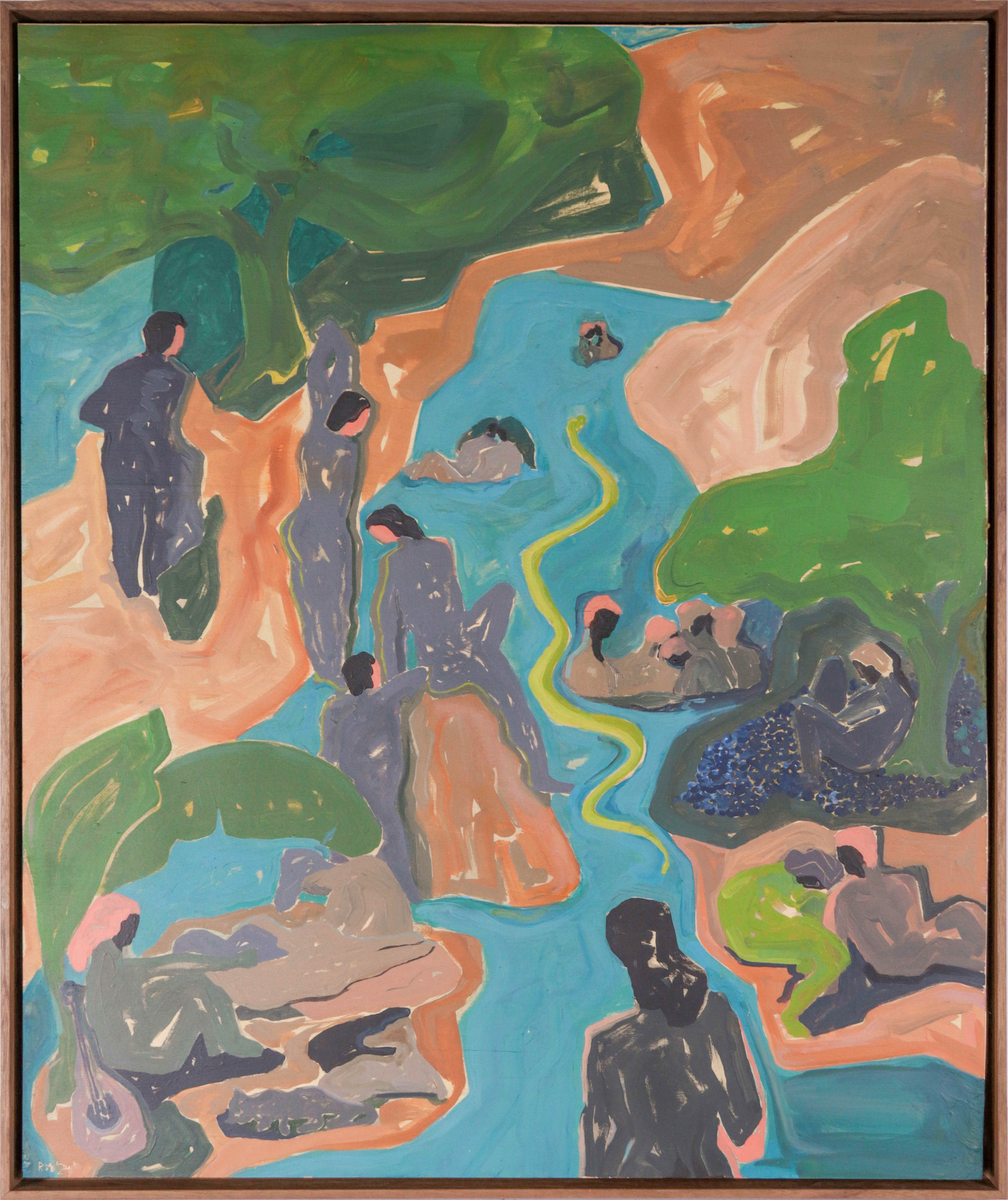 Entitled A New Eden, this 2024 hand-mixed pigment on panel scene is by San Francisco artist and Lost Art Salon co-owner Rob Delamater (b.1966). Delamater creates abstract and figurative compositions that evoke organic shapes and motifs from the natural world. His works are created using various forms of printmaking, painting, and collage.